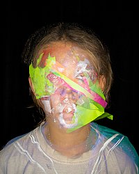 Chaque jour, après une discussion pour se sensibiliser aux enjeux de la reconnaissance faciale, les participant-es ont expérimenté différentes techniques de maquillage : formes permettant de couvrir le visage en cassant sa symétrie (avec maquillage gras coloré, pinceaux, éponges, scotchs et pochoirs en papier autocollant), collages pour créer des « excroissances » sur le visage (papiers colorés et colle à faux-cils), gommettes (pour réfléchir la lumière) … Les participant-es ont ensuite testé leur maquillage dazzle à l’aide de différents sites ou applications – sans capture d’image – puis ont posé pour des photos individuelles, qui sont diffusées superposées les unes aux autres.
