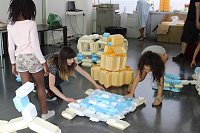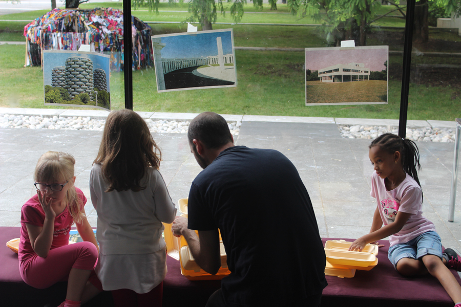 À partir de l’exposition de Kader Attia, « Les racines poussent aussi dans le béton », et de l’expérience quotidienne de leur habitat par les participants, cet atelier se propose d’être un laboratoire d’expérimentation architecturale par la réalisation d’un ensemble urbain en miniature, en utilisant comme matériau de construction un objet industriel tiré du quotidien, la boîte de kebab. Par le biais de cette activité ludique et créative, il s’agit d’ouvrir à un nouveau regard sur l’architecture afin que tous l’apprivoisent, en comprennent les enjeux et s’en émancipent. Cette pratique a également été l’occasion pour les enfants de s’interroger sur les notions de copie, de sosie et de culture populaire.