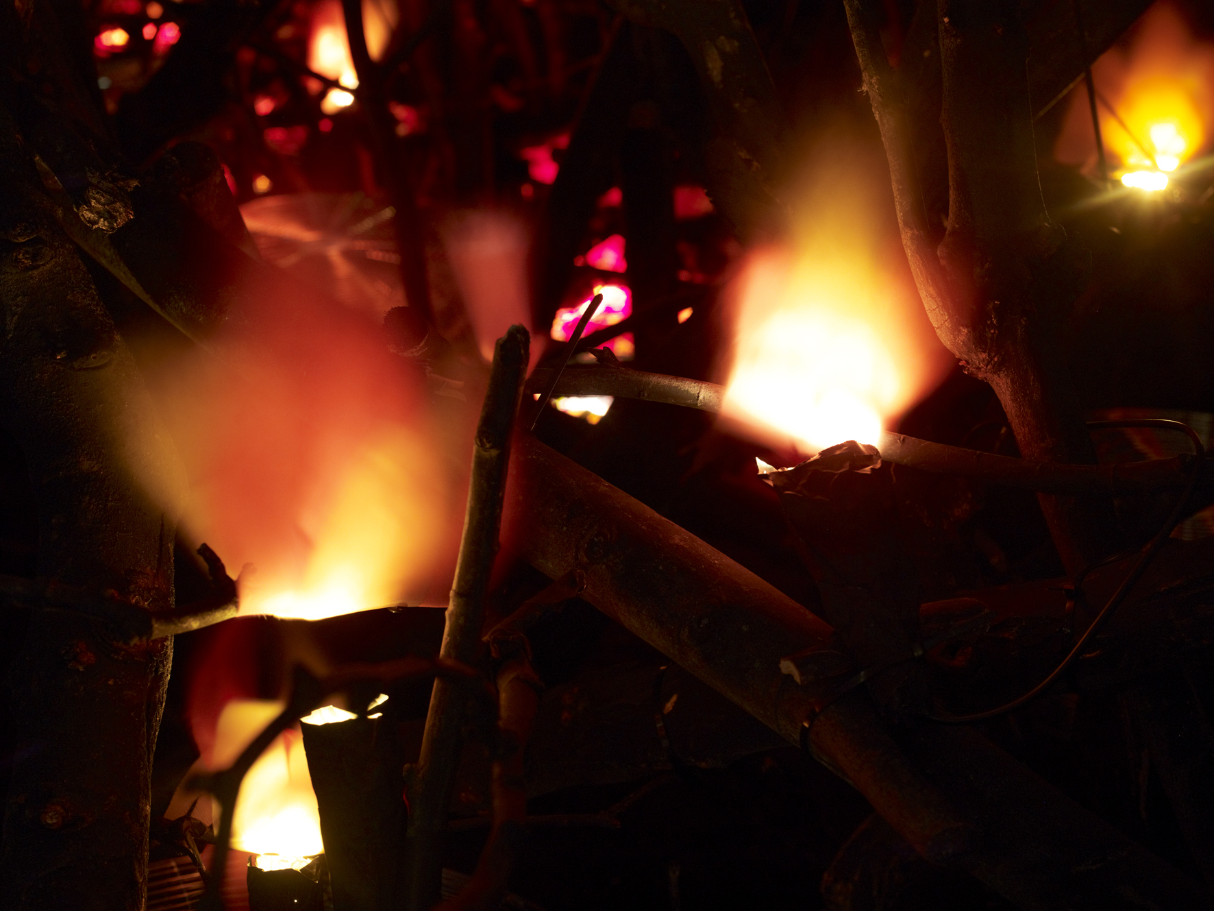Du 22 octobre 2011 au 5 février 2012, cette installation spectaculaire interroge les relations à l’environnement social mais également à l’environnement naturel. Ainsi, les trois complices investissent le vaste espace de la nef du musée pour produire un immense bûcher intérieur. Intitulée Spectacles + Problèmes, l’installation est bricolée avec des branches et divers objets de rebut, animée de flammes factices faites de rubans colorés et ventilés.