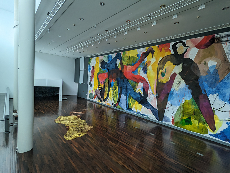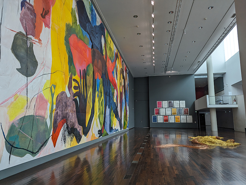 En résidence au MAC VAL de mai à juillet 2024, l’artiste a créé Conjurer l’horizon, une peinture monumentale à l’huile sur papier, accompagnée d’une sculpture en fil d’aluminium, de gravures et de lettres.