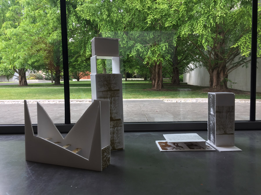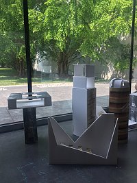 L’artiste a d’abord présenté son travail personnel puis le projet, expliquant notamment la technique de la sérigraphie. Dans l’exposition sur Jacques Ripault, architecte qui a conçu le bâtiment du MAC VAL, on a découvert la maquette du musée. Dans le jardin les participants, adultes et jeunes, ont pris des photos en gros plan de surfaces (pierres, végétation, béton, métaux et murs) pour découvrir des motifs destinés à être imprimés par sérigraphie sur le carton plume utilisé pour fabriquer les maquettes.