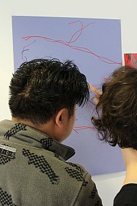 Ce parcours au MAC VAL, Françoise Tartinville l’a conçu comme un atelier hebdomadaire se déroulant à la fois dans les salles d’exposition et dans une salle pédagogique, transformée en salle de danse le temps des séances. Il s’agissait de créer un espace de rencontres, un espace ludique à l’écoute des sensations pour créer de la danse et du mouvement, en lien avec des œuvres du musée :