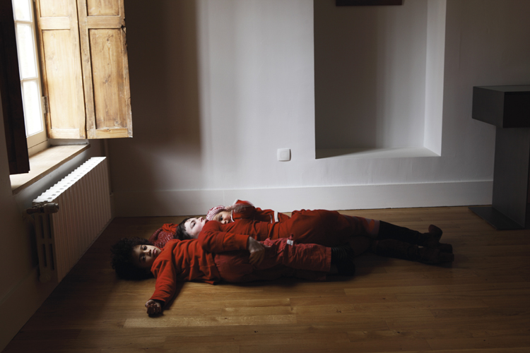 « Corps de masse » est un projet né d’ateliers menés au Musée d’art et d’histoire de Saint-Denis, installé dans un ancien carmel. Halida Boughriet a filmé des habitants de la ville, familles, jeunes, groupes d’amis, invités à se rassembler, s’enlacer et faire corps devant la caméra, avant de se séparer lentement. Les scènes se déroulent dans les salles du musée, autrefois cellules des religieuses, espaces exigus, contraignant l’artiste à des cadrages serrés. Les corps unis, baignés d’une lumière naturelle, reprennent inconsciemment les postures des sujets des peintures classiques exposées. Le temps de la pose, ils s’abandonnent à des gestes d’amour, d’amitié, de fraternité, puis se détachent, glissent et s’isolent en silence. Seuls les froissements des tissus, les frottements au sol sont alors perceptibles. Instants fragiles, éphémères, ces rapprochements révèlent la nature des liens humains qui font la force de chacun. Les corps, les cheveux se mêlent, se fondent, puis se séparent dans un mouvement calme, apaisant. Lors de cette résidence, Halida Boughriet a réalisé une vidéo et une série de photographies aujourd’hui présentées au MAC VAL, au sein de l’actuelle exposition des œuvres de la collection consacrée à la peinture. En effet, le cadrage, la composition et les clairs obscurs des images de « Corps de masse » confèrent une densité picturale indéniable à cette série.