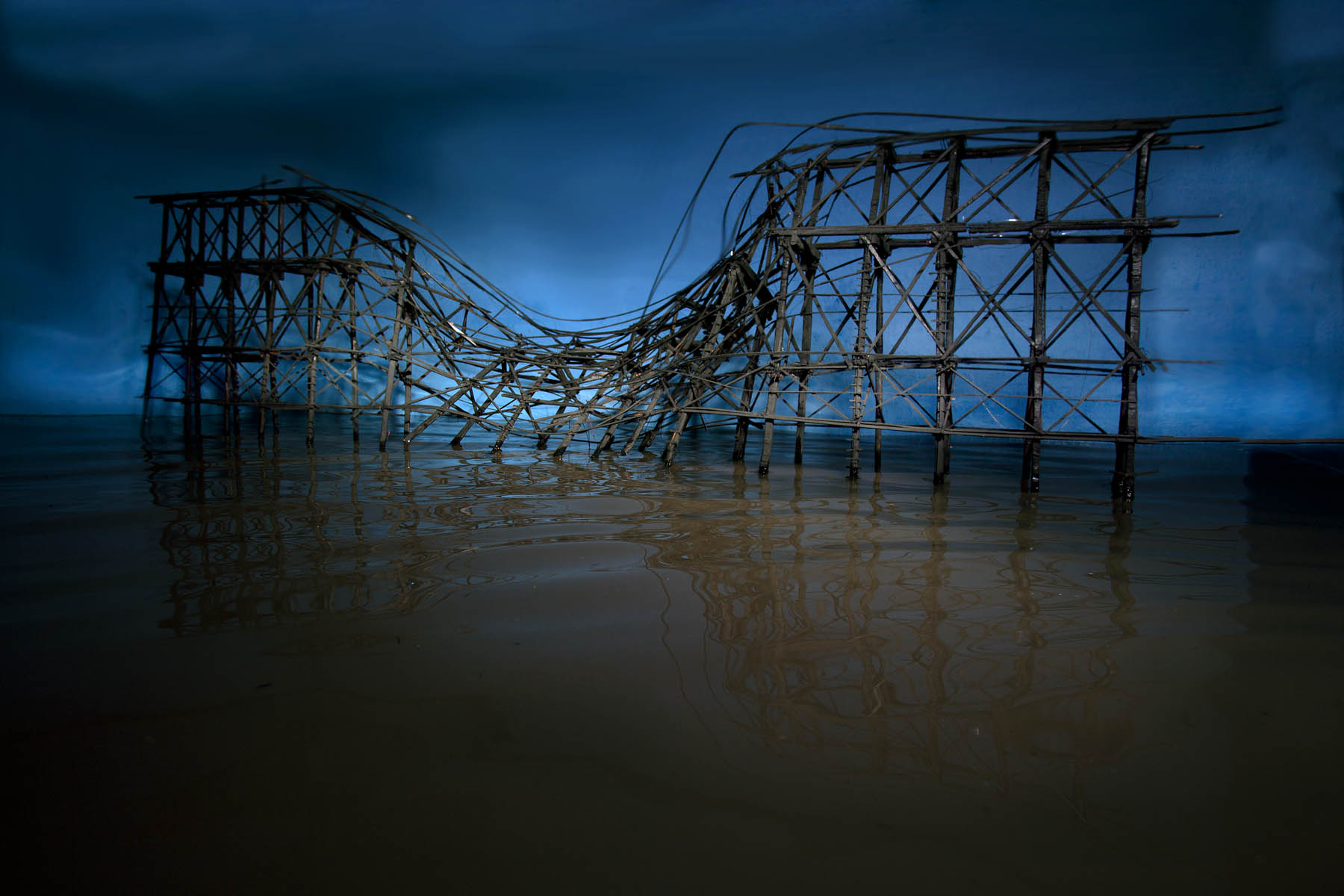 This installation features a big wooden bridge that has collapsed at its centre, summing up the paradox and fragile equilibrium of this construction. The bridge is a connection between two geographies, two peoples and two cultures, or two beings. Symbolically, it marks both a link and a break between one being and another. The bridge abolishes frontiers, uniting and separating at the same time.