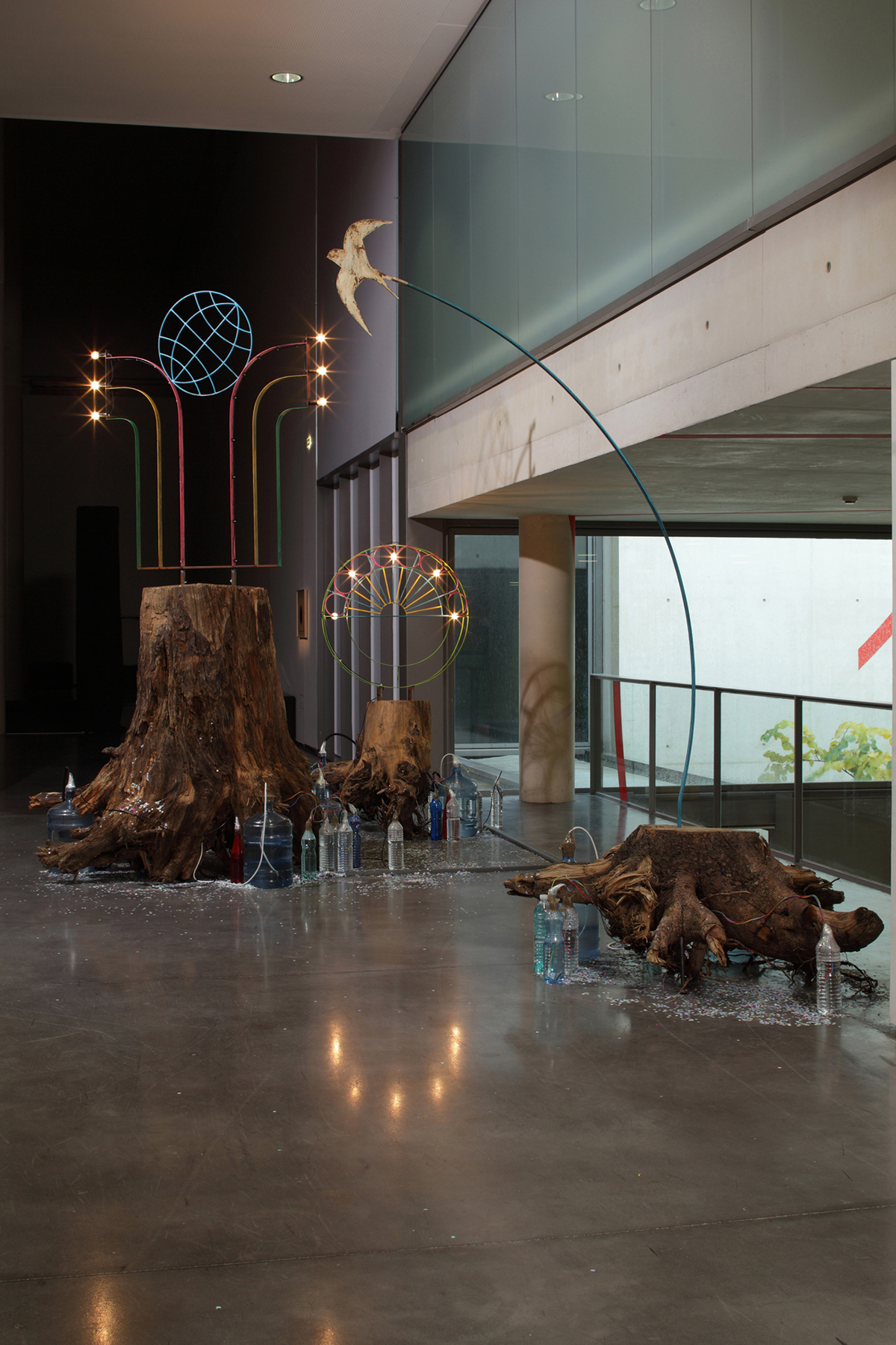 At the MAC/VAL, they are tree stumps which – according to your viewpoint and relationship chosen between outside and inside – are irrigated, fed or constrained, emptied of their sap by this “artificial limb” a corolla made from plastic water bottles. The tree stumps are the foundations and roots of old metal logos whose original functional contexts are unknown reinforcing the synthesis between the obsolete, the absurd but also the capacity for any logo to be given a new meaning. According to Irina Korina, “trees are like neutral and eternal witnesses.”