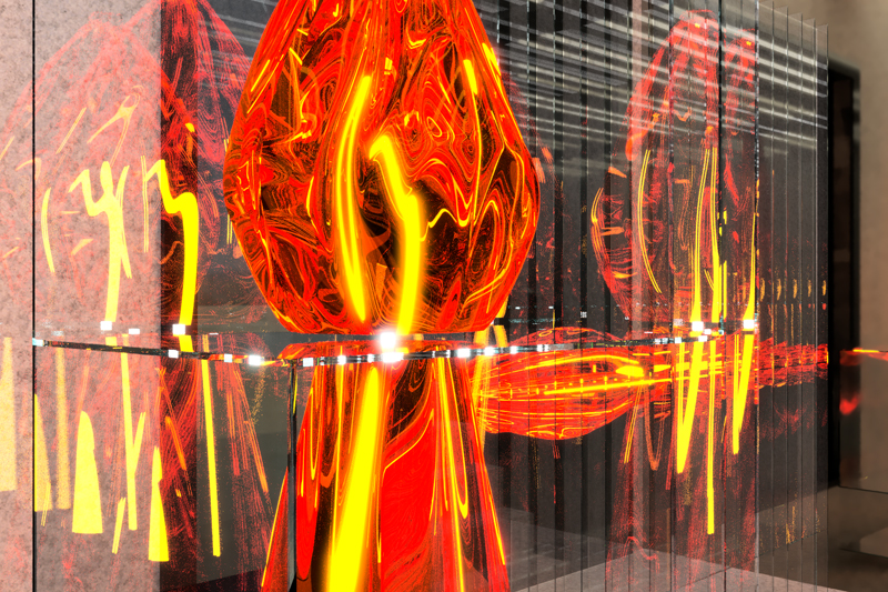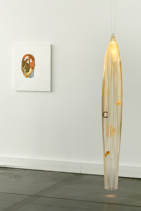 Pour The Kooples Art Prize, l’artiste présente des enveloppes oblongues parées de reflets liquides, d’une préciosité toxique. En stratifiant des matériaux composites, par des jeux de transparences et de reflets moirés, il crée des mondes à l’intérieur desquels se révèlent des objets. Il met ici en scène les mécanismes d’accumulation du capitalisme et d’appropriation matérielle.