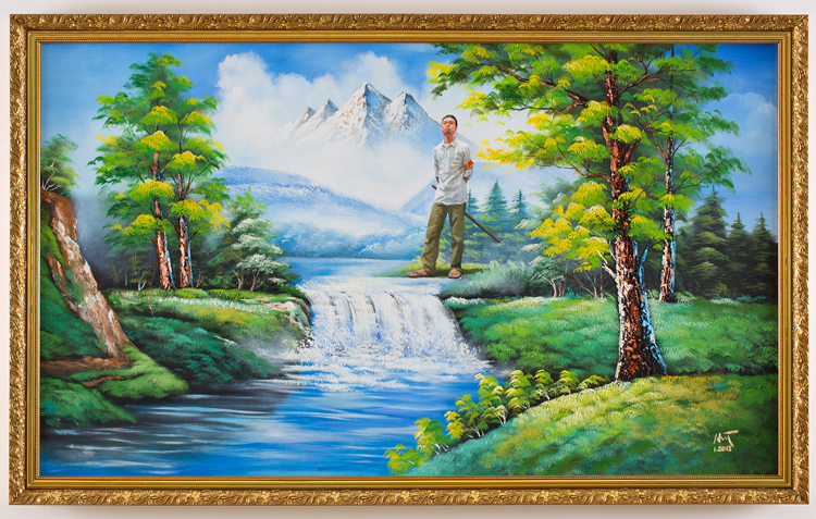 Pour sa résidence au MAC VAL, Nguyen Manh Hung poursuit sa série « Ready-made paintings » (2013) commencée au Vietnam. Il y questionne le concept de copie et de production en série de peintures de paysages en Chine puis au Vietnam et peint ses propres personnages (autoportraits, soldats…) sur les toiles qu’il achète. Lors de son séjour à Vitry-sur-Seine, il poursuit cette série sur le territoire francilien en s’intéressant aux tableaux chinés sur les marchés aux puces, inscrivant ses personnages dans des représentations populaires de paysages européens.