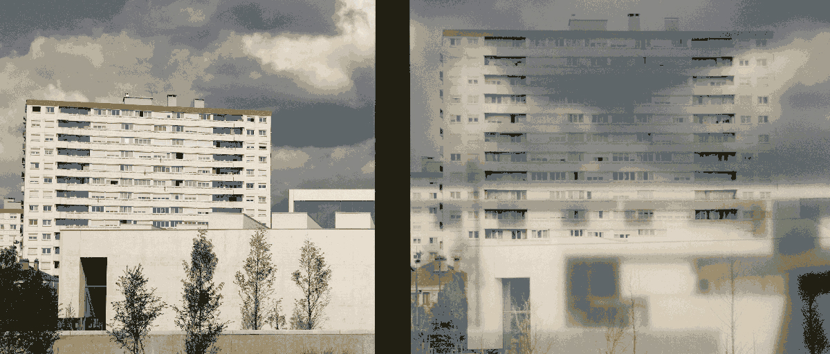 Gwen Rouvillois s’intéresse à l’urbanisme et aux architectures de banlieue, portant un regard inédit sur ces immeubles « sans qualité » directement hérités des utopies modernistes d’un bien-être collectif. Après sa première « vitrophanie » de l’hiver 2005, elle renouvelle sa proposition, décalant à nouveau la perspective, et propose un autre point de vue sur l’alentour du MAC VAL.