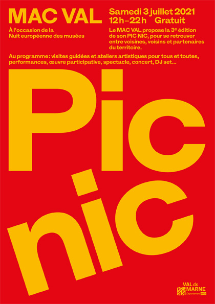 À l’occasion de la Nuit européenne des musées 2021, le MACVAL propose la troisième édition de son PICNIC, pour rassembler voisines, voisins et partenaires du territoire. Retrouvons-nous pour cet événement gratuit qui privilégie le plaisir d’être ensemble, de partager un moment convivial et festif dans les différents espaces du musée.