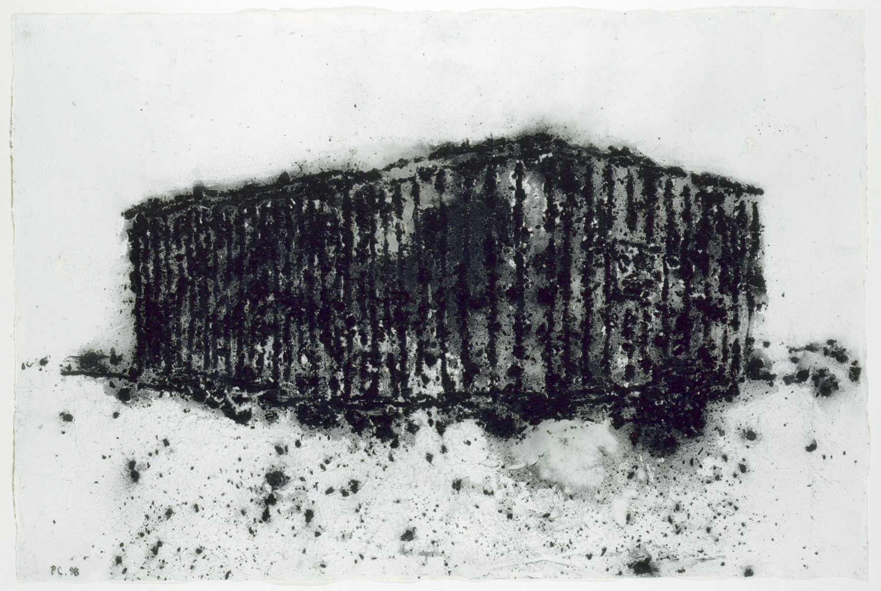 Les containers et cabanes de chantier, que l’artiste introduit dans son répertoire en 1995, satisfont cette exigence. Ils occupent également les dessins de la période, comme ce Container de la série « Proliférations ». Techniquement, l’écrasement du dessin répond à la fonte forcée de la peinture. Recouverte d’un film plastique, la composition au crayon graphite et fusain, sur un fond épais d’acrylique blanche encore humide, est pressée sous un rouleau que l’artiste passe à sa surface. Les morceaux de fusain éclatent. Le trait se fragmente. Aux effets de matière de la peinture, le dessin répond par la rugosité d’une surface crayeuse. On devine aisément la composition photographique initiale : un container, cadré au plus près, isolé dans un paysage privé d’horizon. Ce sujet banal, apparemment neutre, d’une frontalité que ne renieraient pas Bernd et Hilla Becher, bouche l’espace.