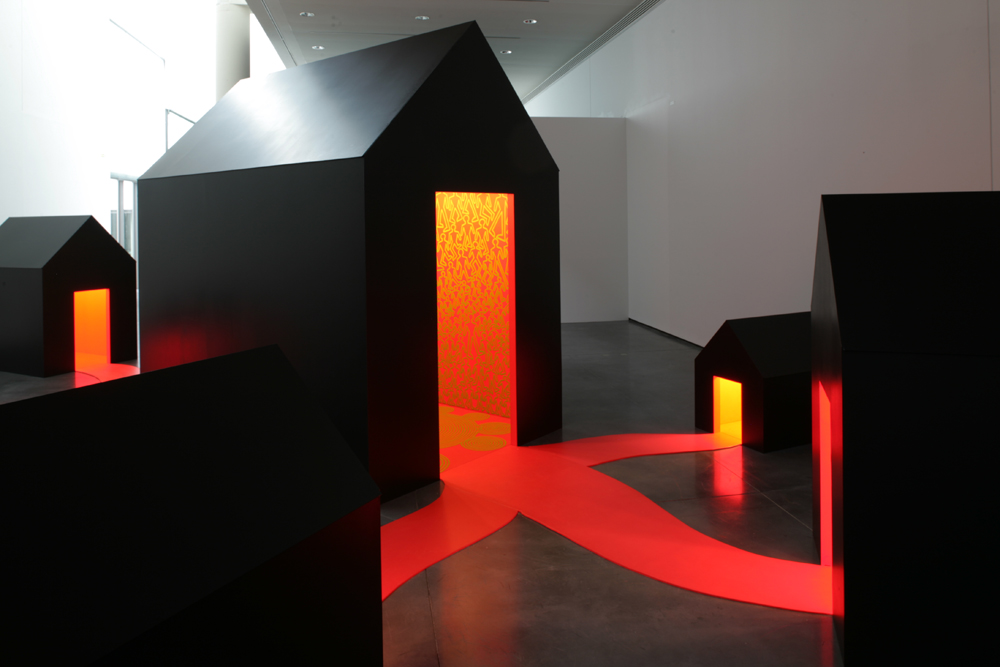So it’s not surprising that the novel L’adversaire (2000) by Emmanuel Carrère, inspired from a real event, absolutely fascinated Pirjetta Brander. This book, after made into a film, retraces the steps of Jean-Claude Romand, a man who killed his entire family in 1993, frightened they would discover his life-lie. For years, he pretended to be a doctor at the World Health Organization working in Geneva. He borrowed money from relatives who believed they were contributing to a worthy financial investment, whereas he spent his days on motorway rest areas where he finally organized this impersonation until the tragedy. The Village thus emits a high-tension ambiance and the artist even speaks of a “visual sauna” to characterize this disturbing experience. The “mother-house” epitomizing the heart of the village, is interfaced to six other smaller houses by paths, large red-tinted vinyl blocks similar to blood vessels, upon which the visitor can wander. A strong light radiates from the seven houses, confirming the idea that these are households. This grouping makes us think of tales like Hansel and Gretel, Little Red Riding-hood or even the video Marsu (2003) where the artist filmed her own daughter dressed up like a princess, moving about and singing. The artist takes these recordings in playback where this little girl then seems to express her emotions in an angry and bitter way.