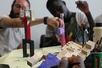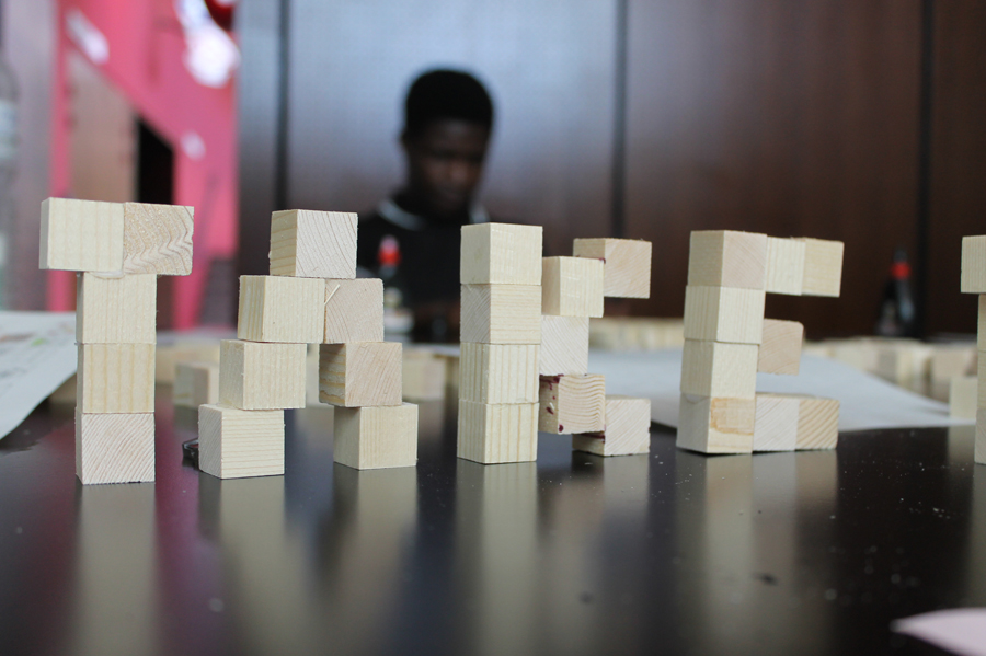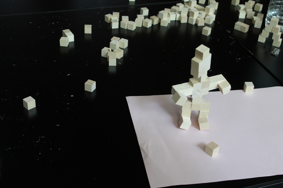 Avec des mineur.e.s isolé.é.s du centre Croix Rouge de Villejuif, nous avons dessiné dans ces carrés de manière organisée, automatique, collective… Puis nous sommes passés de la deuxième dimension à la troisième dimension, toujours avec des carrés de 2.5cm, à la fois brique et pixel, pour constituer une galerie de sculpture entre autoportrait et états de conscience. Nous nous sommes concentrés, décentrés, recentrés, dans tous les coins. Le coin étant ici une métaphore de la position existentielle : ouverture, engagement, désengagement, empêchement.