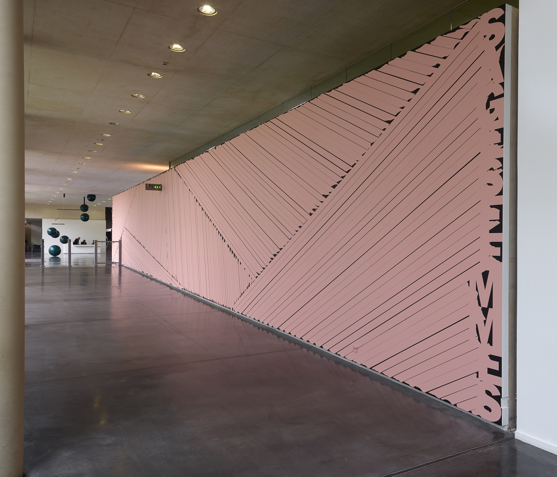 SAGESFEMMES, c’est avec ces mots riches de sens que Sylvie Fanchon accueille le public dès l’entrée du musée. Invitée par le MAC VAL à réaliser un mural in situ, l’artiste propose un « Tableau Scotch ». Le recours aux bandes adhésives, au masquage, lui permet d’accepter une part de surprise, de hasard dans sa pratique. Son œuvre murale, un dessin géométrique, offre une surface striée, hachurée, plus ou moins rythmée. Les bandes de couleur rose poudré renvoient à la féminité, au maquillage, aux bas de soie, mais aussi aux sparadraps évoquant les blessures intimes, celles de la chair et de la vie. Les « Tableaux Scotchs » de Sylvie Fanchon sont-ils des surfaces de réparation ? Évocations du corps féminin, du corps désiré ou du corps meurtri, blessé, ils sont tout à la fois, douceur et douleur mêlées. Rassemblées sous le titre Chair, d’un rose qui n’est pas si sage, ces peintures donnent le ton.