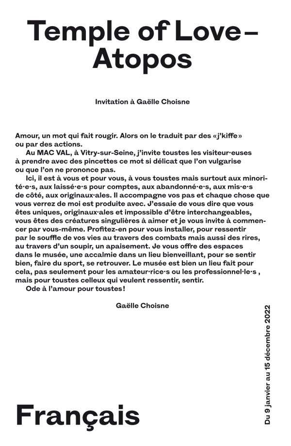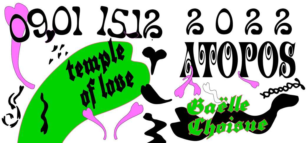 "Chaque itération de « Temple of Love » met au centre de son propos la relation. À cet égard, le remploi de Textus (2018), œuvre du premier « Temple of Love » dans « Temple of Love – Atopos » renseigne sur les enjeux de relations que l’artiste pense et cherche à instaurer depuis et dans l’espace d’exposition. Textus est une installation de tissus, un assemblage de tissus élastiques aux coloris beige et rose vif tendus et cousus chaotiquement.