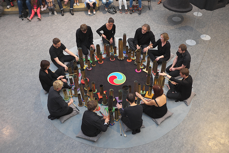 Sounds of war est une œuvre composée de cent obus datant de la Première Guerre mondiale. La sculpture devient performance lorsque Léa Le Bricomte invite une douzaine de musiciens à jouer une musique nouvelle en révélant « le potentiel des obus reprogrammés en instruments de paix. » L’intervention du corps, l’exécution de gestes ancestraux, l’activation sonore et l’écoute du public engendrent la mutation de l’œuvre. Par le déplacement des fonctions et des symboles, nous assistons à la réactivation de différentes traditions. Décontextualisées et reformulées, les pratiques du mandala et du bol chantant tibétain sont réinscrites dans une création à la fois personnelle et collective.