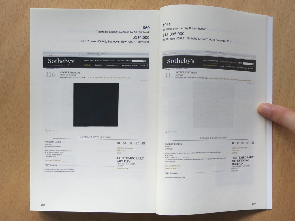 En s’appuyant sur les vis-à-vis page paire, page impaire, cette publication confronte les résultats de la vente aux enchères de 300 œuvres d’art. Elle met en perspective choix (Pick) et marché (Hammer). Page 16 un IKB d’Yves Klein, page 19 Bingo d’Oscar Murillo, page 20 Blah Blah Blah de Mel Bochner, page 23 Bruce Lee : Fighting Spirit de Yan Pei Ming, page 34 The Graces de Joel-Peter Witkin, page 37 The Fake Rothko d’Adrian Ghenie, page 38 sans titre (Mur de brique) de Victor Vasarely, page 47 Triple Elvis de Jeff Koons, page 50 Empreinte de pinceau n° 50 de Niele Toroni, page 73 Picasso de Kang Hyung-Koo, etc.