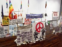 State Britain reconstitue le campement de Brian Haw, infatigable militant activiste antiguerre. Pendant cinq années, celui-ci a accumulé banderoles, drapeaux, messages, citations, images, coupures de journaux, face au parlement britannique, pour dénoncer les sanctions économiques prises à l’encontre de l’Irak, puis de l’engagement du Royaume-Uni dans la guerre.